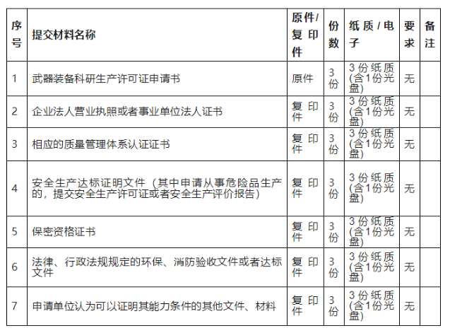 二、武器裝備科研生產(chǎn)許可證申報要求: